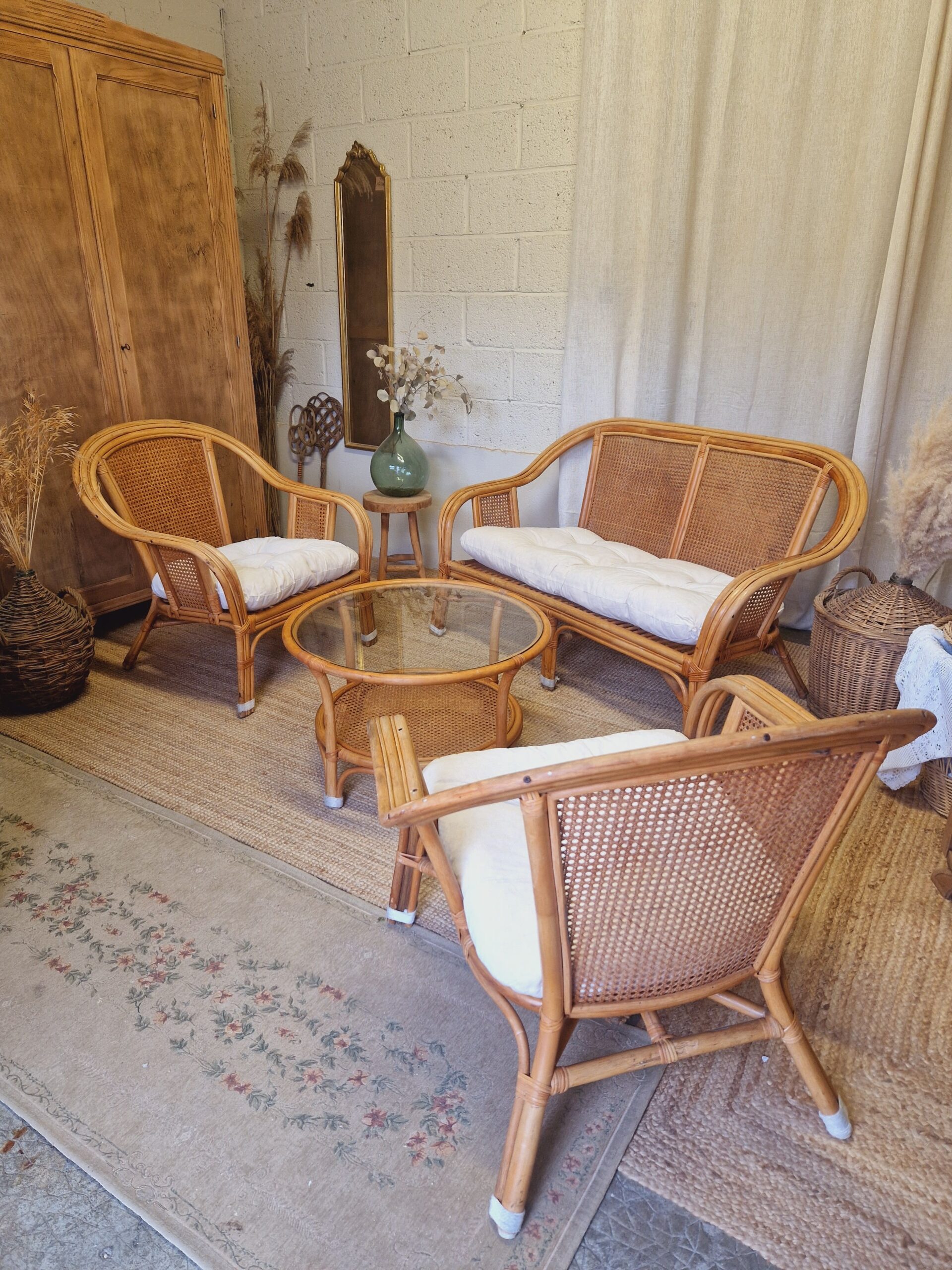 125€ (banquette 2 places, 2 fauteuils, 1 table ronde vitrée et coussins d’assise)